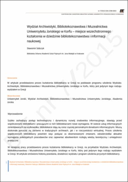 Wydział Archiwistyki, Bibliotekoznawstwa i Muzealnictwa Uniwersytetu Jońskiego w Korfu – miejsce wszechstronnego kształcenia w dziedzinie bibliotekoznawstwa i informacji naukowej